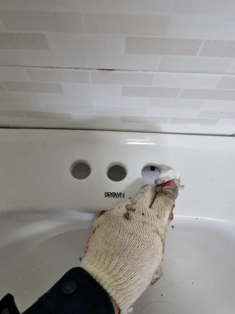 수전을 제거한 후 세면대의 설치 구멍 주변을 깨끗하게 청소합니다. 오래된 실리콘이나 때가 끼어있으면 스크레이퍼나 칫솔로 제거합니다. 구멍 안쪽도 닦아내야 새 수전을 설치할 때 밀착이 잘 되고 누수가 발생하지 않습니다.